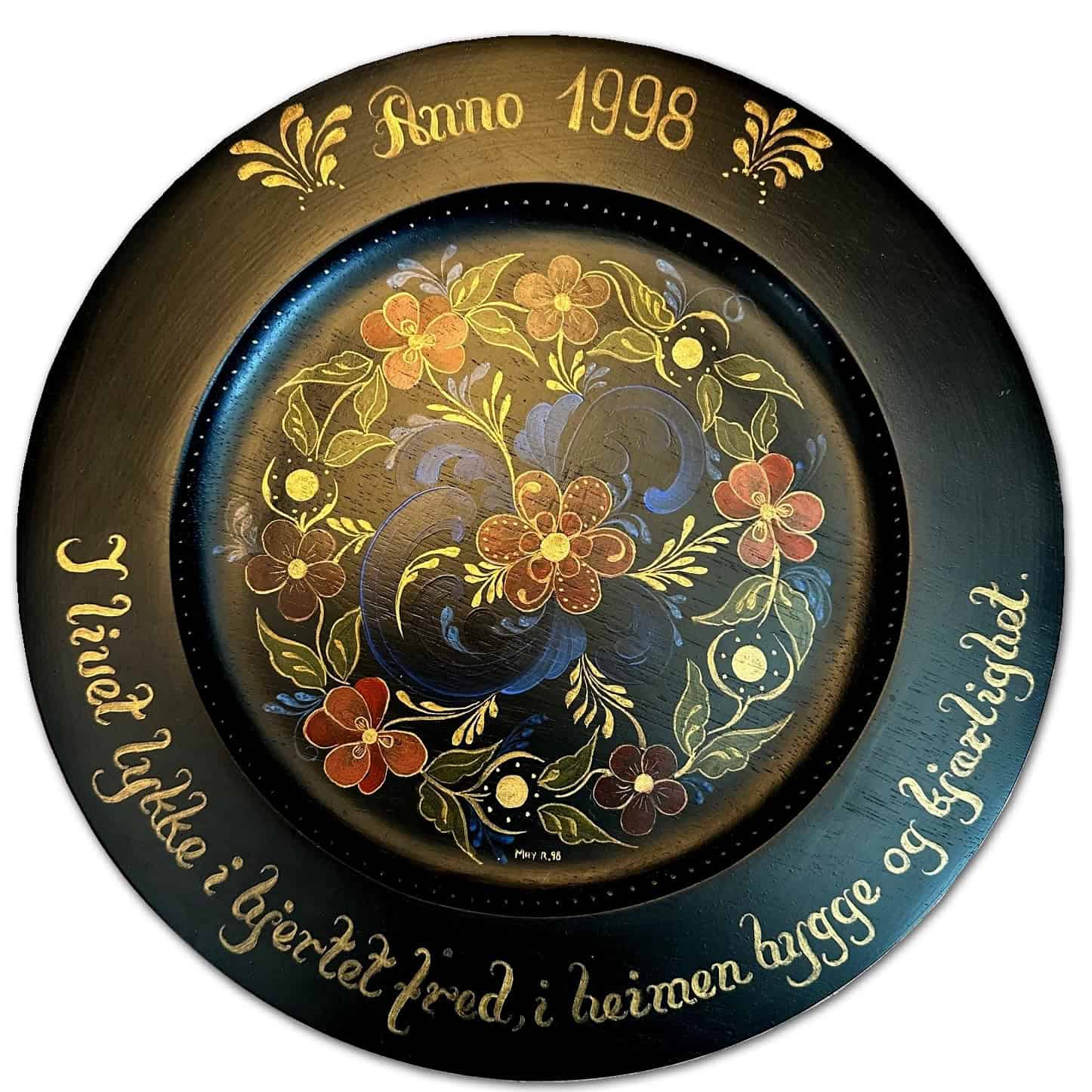 Painted in 1998, this black wooden Rosemaling plate is ready to hang on your wall.  The writing in gold along the bottom says, “I livet lykke ihjertet fred is heimen hygge og kjærlighet” – translated: In life, happiness in the heart, peace in the home, comfort and love.