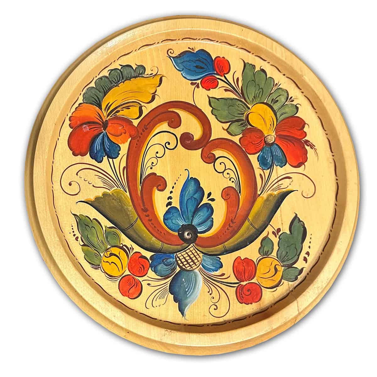 The plate is gorgeous with bright colors of blues, reds, yellows, rust and greens with accents in brown.  The Rosemaling style is Telemark and the artist was obviously very skilled – strokes are powerful and confident.  It looks like there is a nail in the back from when the plate was hung on a wall.  Whether on your wall or on your table, this piece will certainly get compliments!