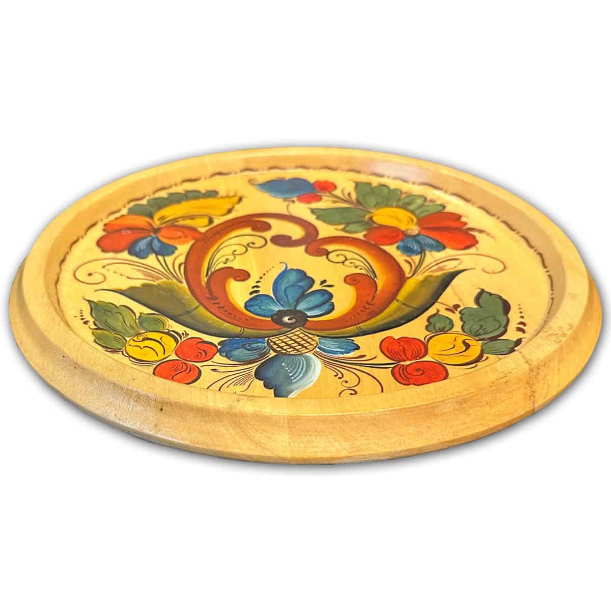 Sadly, sometimes items suffer damage on their way from Norway to Florida. This is the case with this wooden Rosemaling plate. There’s a crack running halfway across a part of the plate. We’ve repaired it but the crack is still slightly visible if you look for it. Please see the photo of the repaired crack.