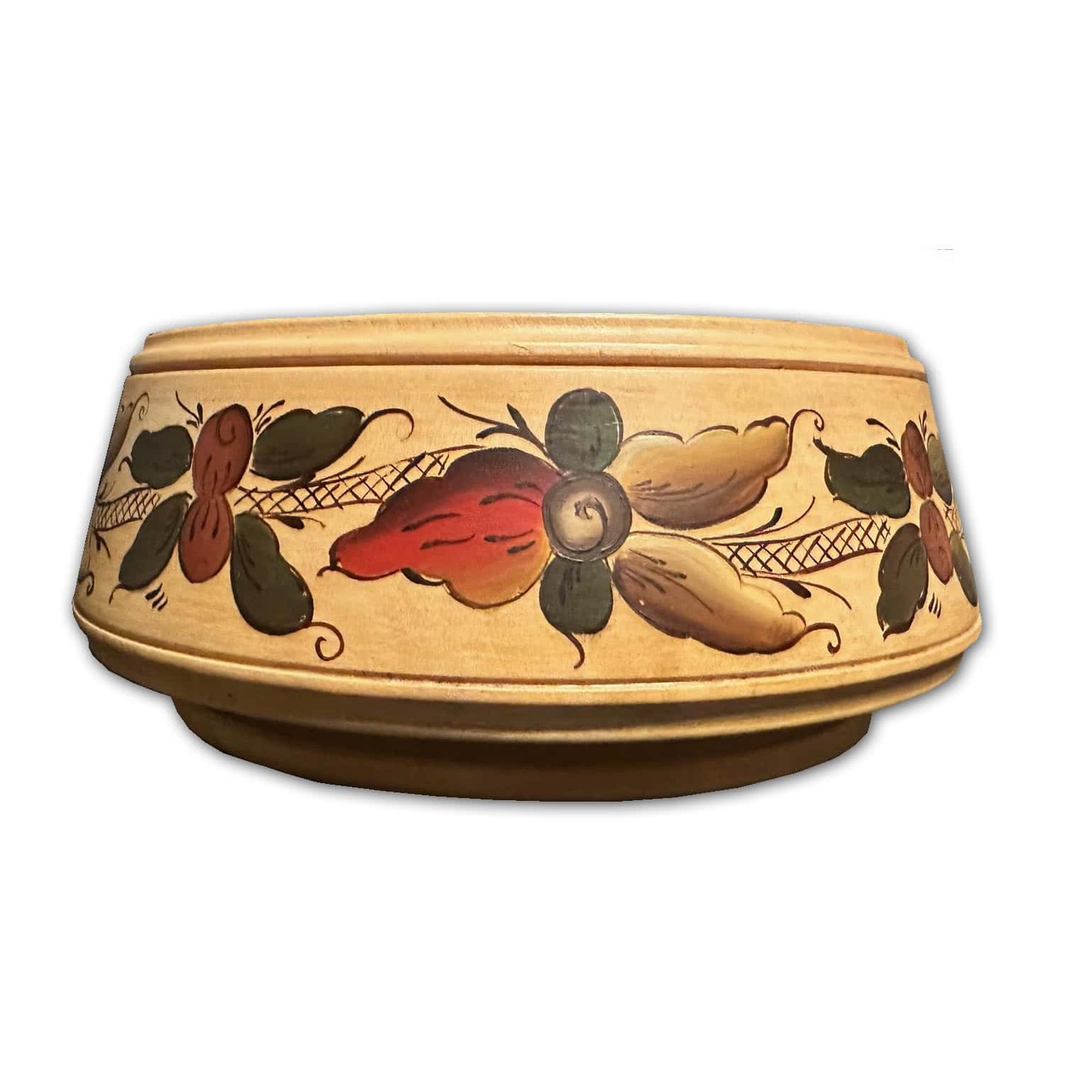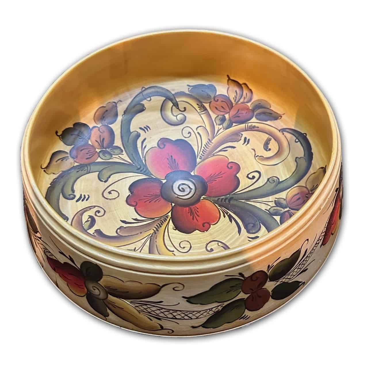 This wooden Rosemaling bowl is a stunner! First, the artwork is impeccable. Painted by Ragnhild Slåttun of Porsgrunn in 1977, the strokes are confident and strong. Ragnhild knew her Rosemaling! The colors are gorgeous against the natural wood grain; greens, red and orange tones, beige and tans with dark brown accents, knowing color combinations is vital in good Rosemaling. The piece is signed by the artist, R.S 1977 on the bottom.