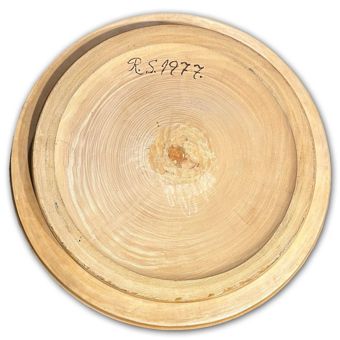 The shape of the bowl itself is unique. It’s concave being narrowing along the rim than the base. It sits raised on its small incorporated pedestal. The bottom shows evidence of the woodworking.