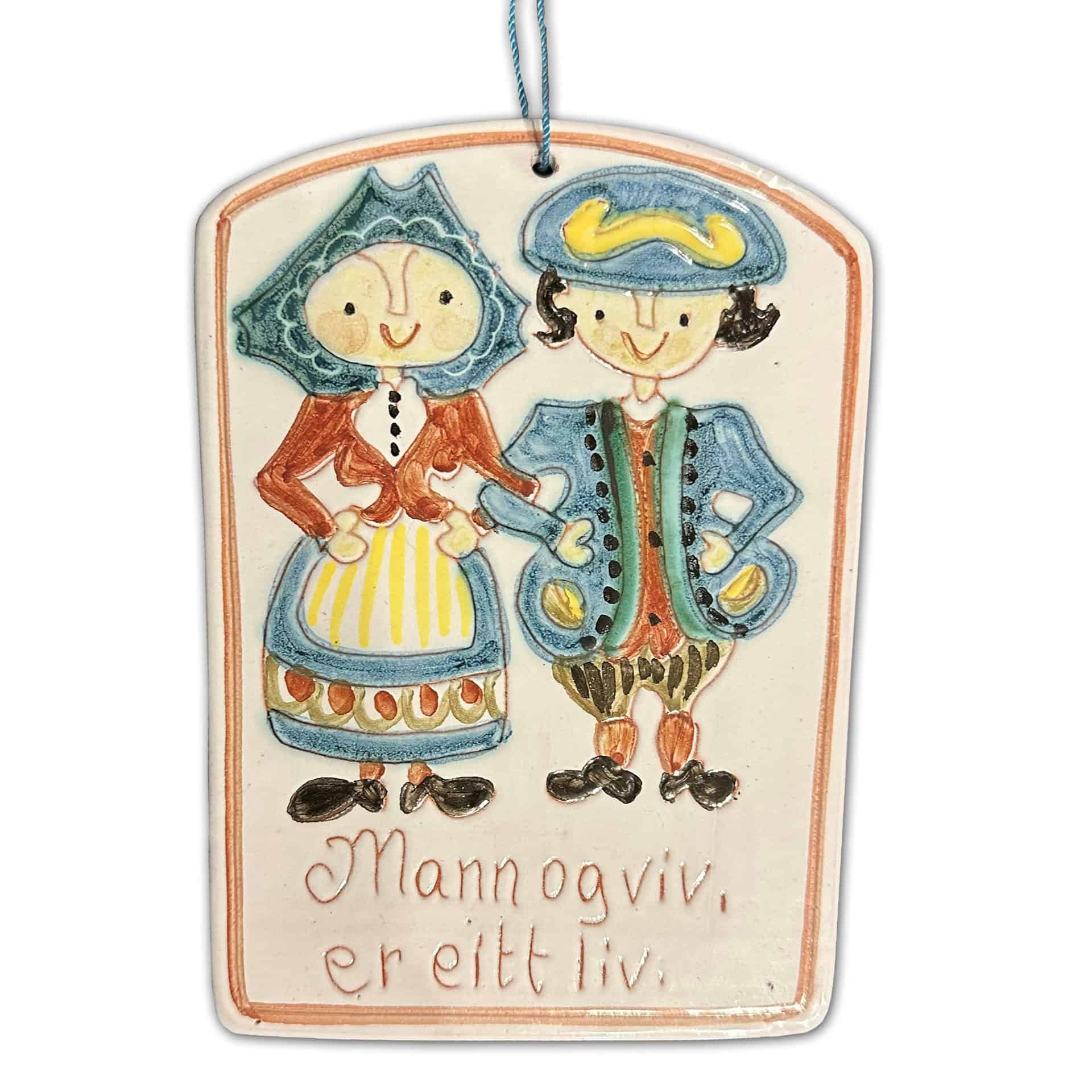 The ceramic shows a folklore style couple and says, “Husband and wife is one life”.  This would be a fun gift for newly weds!  The piece is in great shape with no chips or scratches and is ready to hang on your wall or use as a fun trivet.