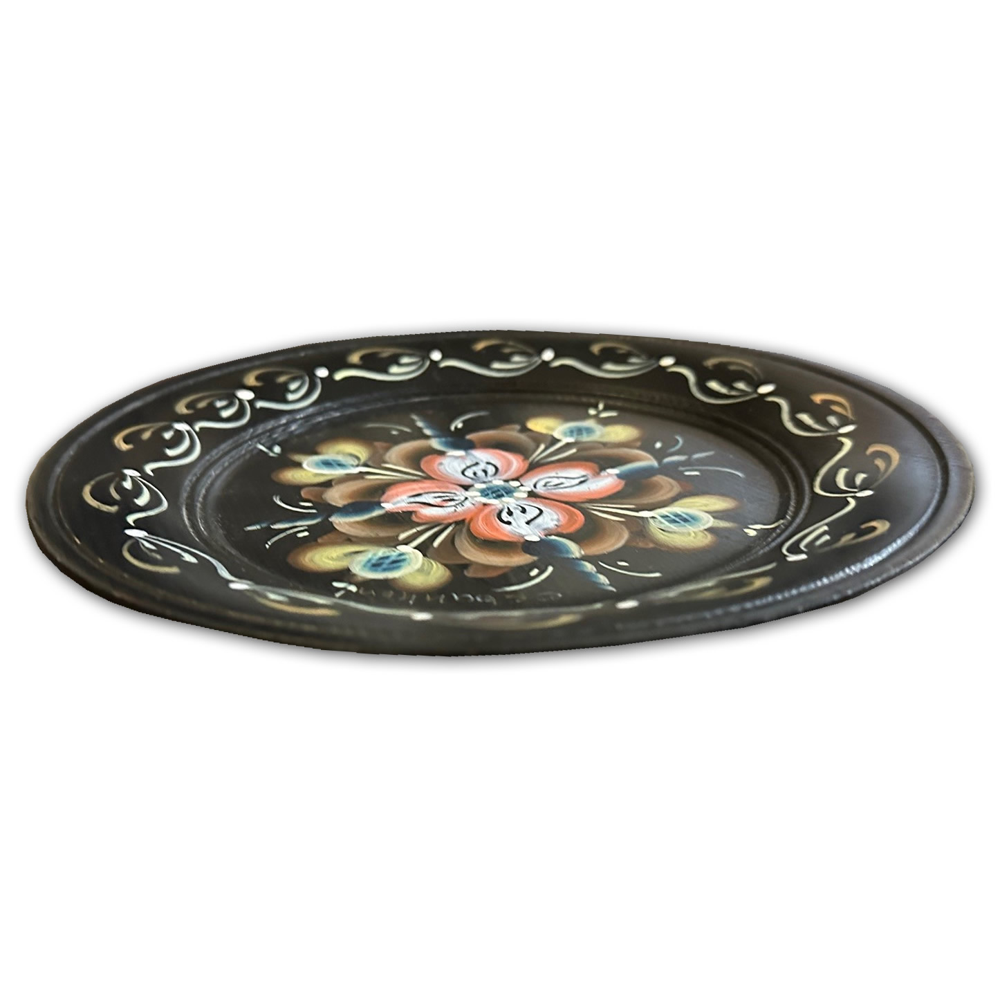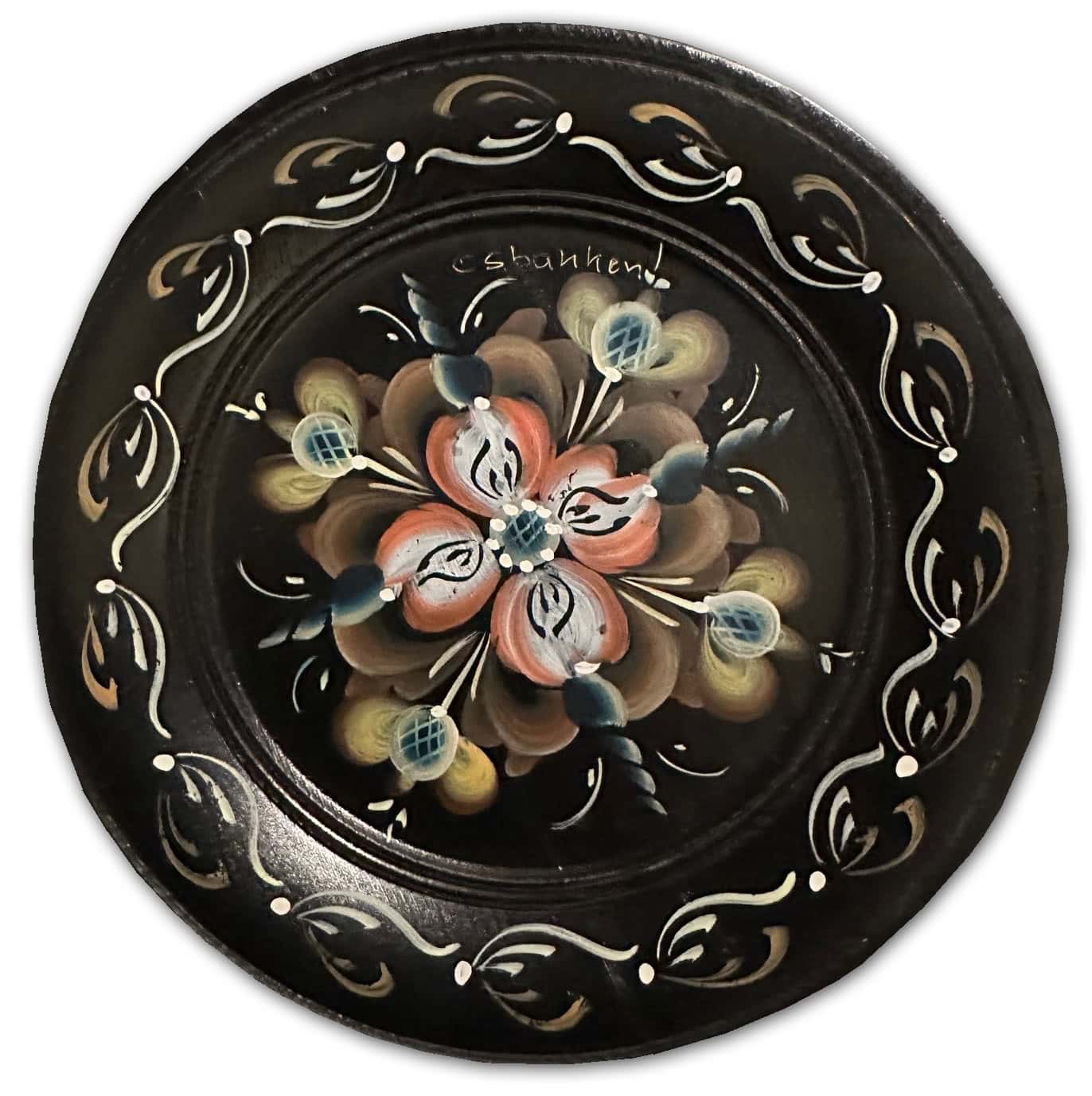 The striking feature of Hallingdal Rosemaling is a central flower around which all things gather symmetrically.  This wooden Rosemaling plate is a great example of the Hallingdal style.  On a black background, vibrant colors including orange, tans, blues and white really pop.  Details and accents are in white and tan.